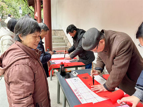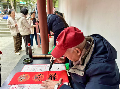 与此同时,西湖公园长亭内墨香四溢。由书法家及书法爱好者组成的志愿队挥毫泼墨,根据居民需求现场书写定制春联。“金马迎春春入户,紫燕报喜喜临门”“福星高照全家福,春光耀辉满堂春”等寓意吉祥的春联跃然纸上,吸引众多居民驻足领取。活动累计送出春联200余副、“福”字100余张,将传统年俗文化融入惠民行动,让社区居民在墨香中感受浓浓年味。
