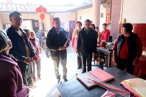 拜谒完祖先,大家齐聚祖厝门前。“家族里还有很多人想认识你。”“我们加下微信吧。”大家互留联系方式,情谊在交流中不断升温。