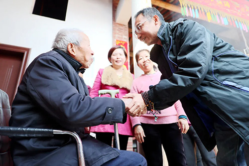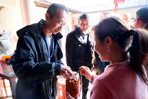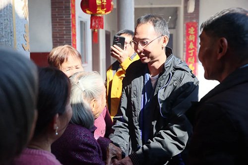 2024年12月30日中午12时40分,一辆载着蔡贵荣的小车缓缓驶入村口。车门开启,这位远道而来的游子终于和家乡的父老乡亲相见。一时间,鞭炮声热烈响起,一双双热情的手伸来,成为迎接他的最好礼物。