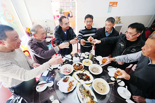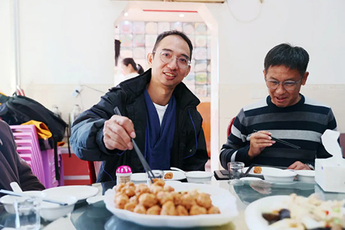 在等待上菜时,蔡氏宗亲拿出家族亲人的照片,细致地向蔡贵荣一一介绍。饭馆老板前来打招呼,大家笑容满面地说:“番客回来,一起吃饭。”为了让蔡贵荣品尝地道的家乡味道,当天的菜品中特意准备了诗山特产——粕丸和糖粿。